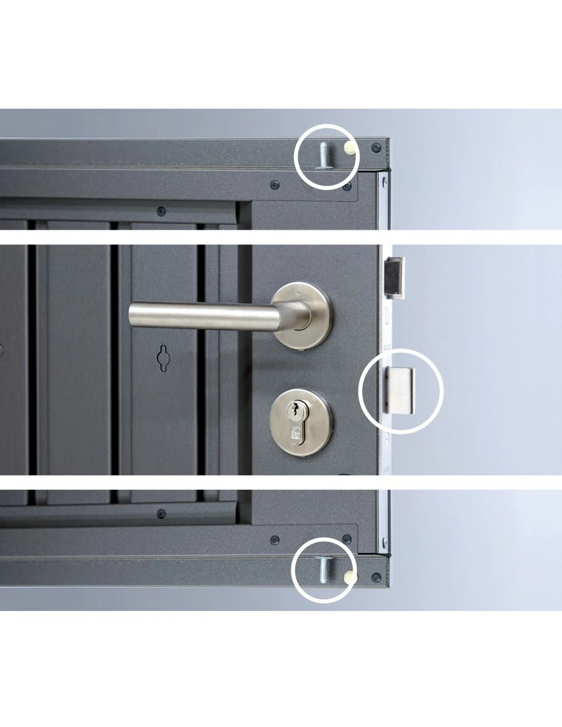 - 1 double-porte de 1.55 m de passage x 1.82 m de haut avec seuil extra plat. La double-porte peut se mettre sur l’un des 4 côtés